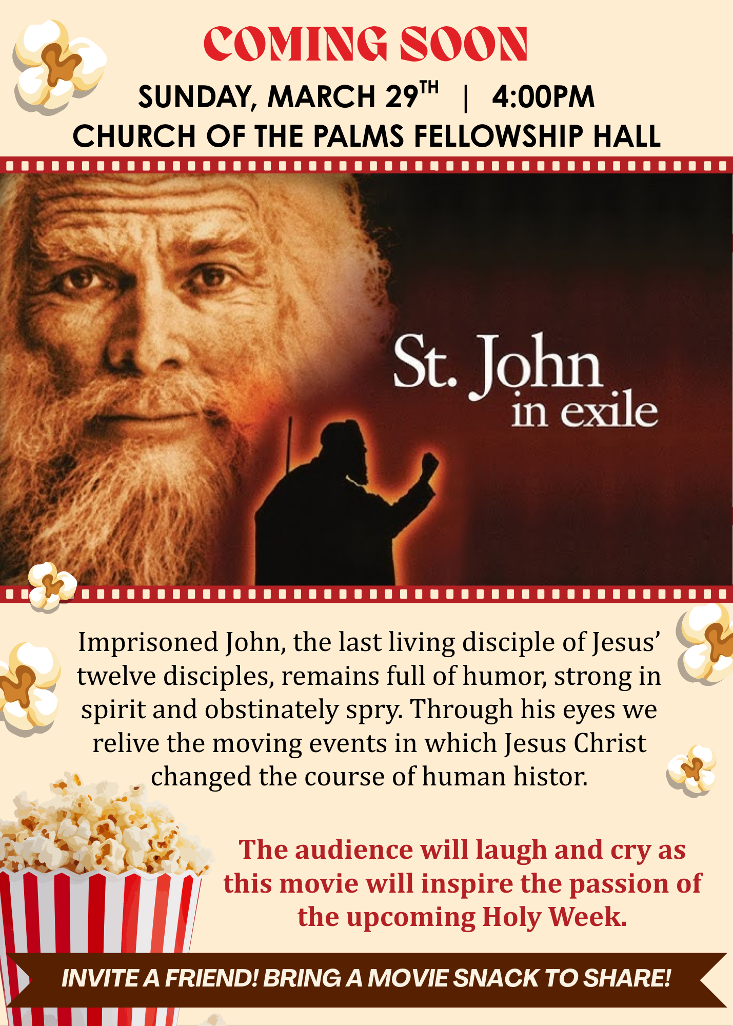 Don’t forget — Movie Night is Sunday 29th at 4:00 PM in the Fellowship Hall! Come watch St. John in Exile and bring a snack to share!